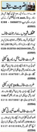 Private Company Lahore, lahore Punjab Pakistan invites applications from eligible candidates for the post of supervisor, accountant, lady computer operator, clerk, manager, security guard, office staff, field staff, security supervisor, office boy, field worker, retired person and call operator as per advertisement of January 9, 2024 published in daily Nawaiwaqt Newspaper. Persons with Bachelor, Master, Middle, Matric and Intermediate etc. education can apply.