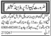 Hotel Multan, multan Punjab Pakistan invites applications from eligible candidates for the post of computer operator and cashier as per advertisement of July 5, 2023 published in daily Khabrain Newspaper. Intermediate, Bachelor and I.com etc. educational qualification will be preferred.