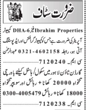Private Company Lahore, lahore Punjab Pakistan invites applications from eligible candidates for the post of cook, chef, computer graphic designer and computer operator as per advertisement of July 20, 2022 published in daily Jang Newspaper. Candidates with Middle, Bachelor, Matric and Intermediate etc. educational background will be preferred.