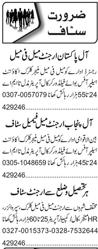Vacant posts including field worker, clerk, female clerk, call operator, manager, female manager, accountant, hr manager, supervisor, computer operator, helper and office boy are announced in Private Company Multan, multan Punjab Pakistan as per 12 August 2023 advertisement in daily Roznama 92 News Newspaper. Persons with Bachelor, Middle, B.com, Intermediate, I.com, BA and Matric etc. education can apply.