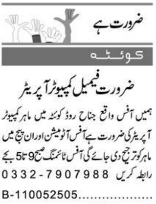 Private Company Quetta, quetta Balochistan Pakistan invites applications from eligible candidates for the post of computer operator and female computer operator as per advertisement of July 20, 2022 published in daily Express Newspaper. Preferred Education is Bachelor and Intermediate etc.