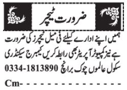 Cambridge Secondary School jobs advertisement dated about 20 April 2024 in daily Jang Newspaper invites application for the vacant post of computer operator, female teacher and teacher in Quetta, quetta Balochistan Pakistan. Bachelor and Master etc. educational qualification will be preferred.