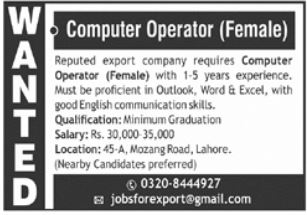 Export Company invites applications for job positions advertised in daily Jang dated 2 November 2025 for following vacancies in Lahore, lahore Punjab Pakistan.
