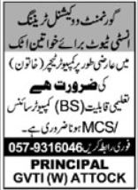 Government Vocational Training Institute for Women Attock, attock Punjab Pakistan invites applications from eligible candidates for the post of female computer teacher as per advertisement of May 28, 2024 published in daily Ausaf Newspaper. MCS etc. educational qualification will be preferred.