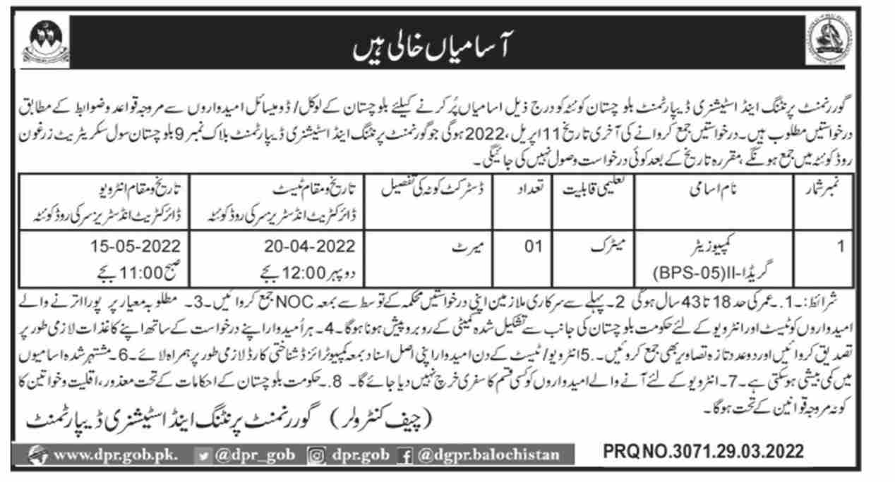 Printing and Stationery Department is looking for candidates for following posts as per job advertisement published in daily Dawn Newspaper of March 31, 2022 for location Quetta, Balochistan Pakistan: