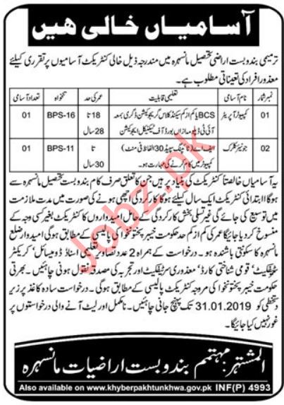 Computer Operator & Junior Clerk Jobs 2019 In Manshera KPK
