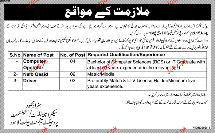 Computer Operator, Naib Qasid And Drivers Job Opportunity
