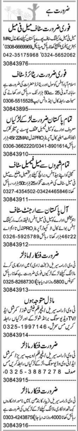 Private Company Faisalabad, faisalabad Punjab Pakistan invites applications from eligible candidates for the post of accountant, marketing staff, helper, field worker, public relation officer, office staff, model, clerk, actor, call operator, manager, marketing officer and pro as per advertisement of February 18, 2023 published in daily Express Newspaper. Persons with Middle, Bachelor, Matric and Intermediate etc. education can apply.