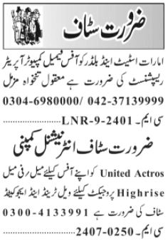 Private Company Lahore, lahore Punjab Pakistan invites applications from eligible candidates for the post of receptionist, office staff, computer operator and female office staff as per advertisement of July 9, 2024 published in daily Jang Newspaper. Preferred Education is Intermediate, BA, Bachelor, Matric and Middle etc.