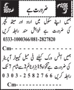 Private Company Quetta, quetta Balochistan Pakistan invites applications from eligible candidates for the post of urdu teacher, computer operator, math teacher and teacher as per advertisement of May 2, 2024 published in daily Jang Newspaper. Candidates with Intermediate, Bachelor, MA and BA etc. educational background will be preferred.