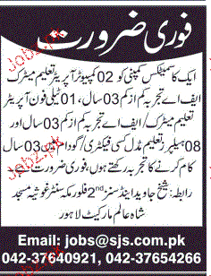 Computer Operators are required in Lahore.