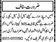 Private School Peshawar, peshawar Khyber Pakhtunkhwa KPK Pakistan invites applications from eligible candidates for the post of female teacher, computer science teacher and teacher as per advertisement of November 29, 2024 published in daily Mashriq Newspaper. Persons with Mphil and MS etc. education can apply.