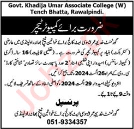 Government Khadija Umar Associate College for Women invites applications for job positions advertised in daily Jang dated 18 August 2024 for following vacancies in Rawalpindi, rawalpindi Punjab Pakistan.