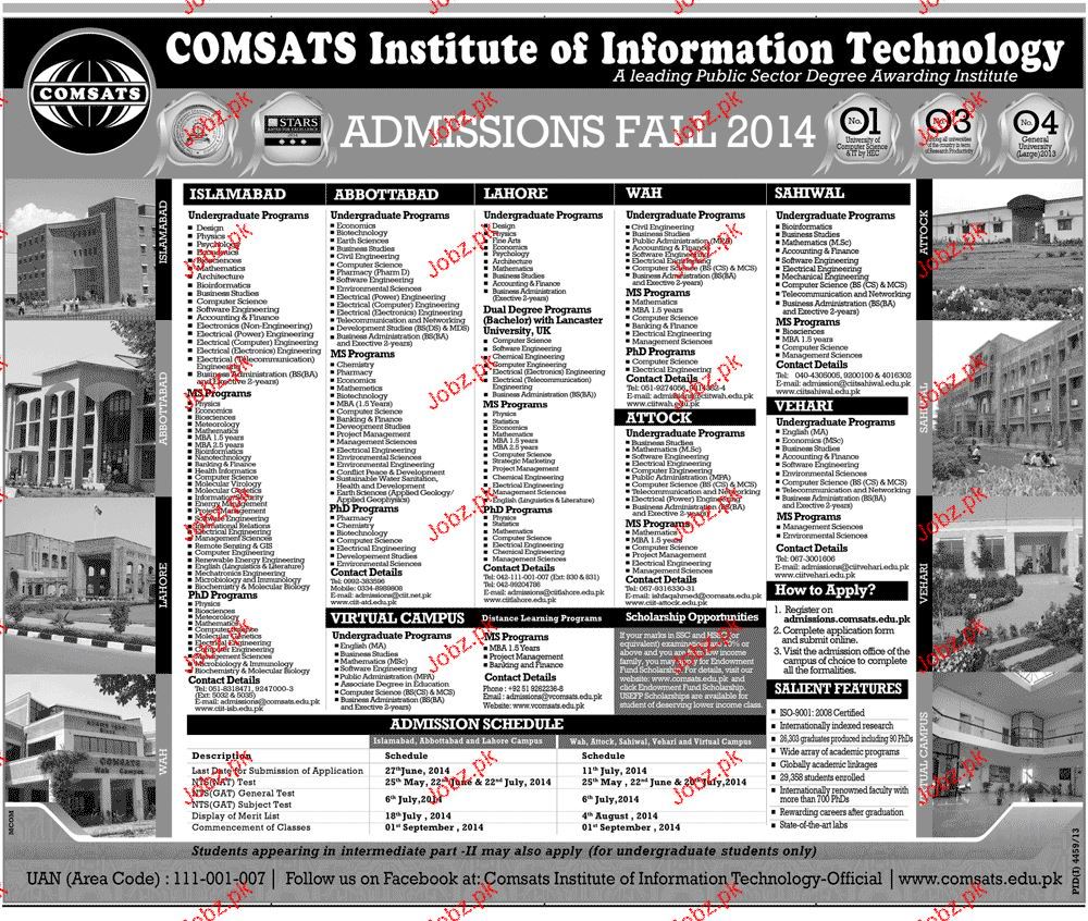Comsats Institute of Information Technology Admission in Undergrdauare Programes in Islamabad Read newspaper ad for exact details.