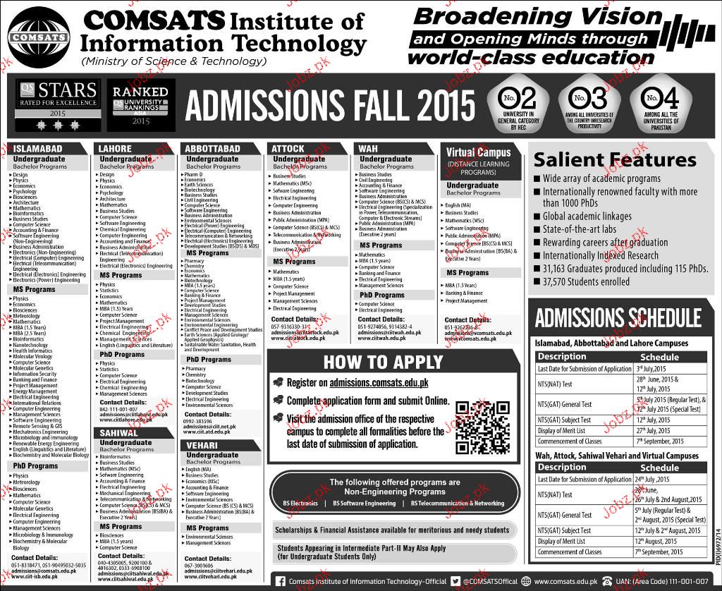 Comsats Institute of Information Technology Admission in Undergraduate Programs in Islamabad. Read newspaper ad for exact details.