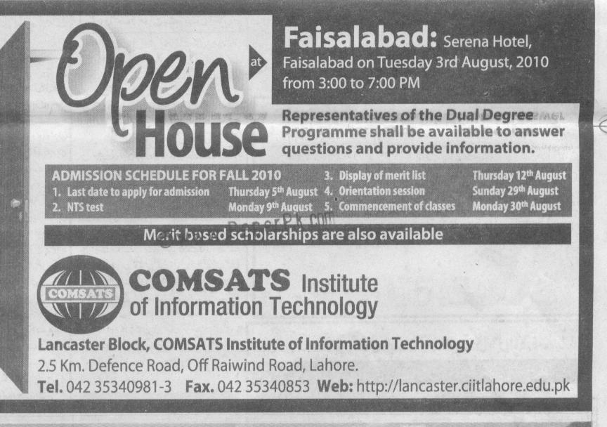 Admission Open in COMSATS Institute of Information Technology Read newspaper ad for exact details.