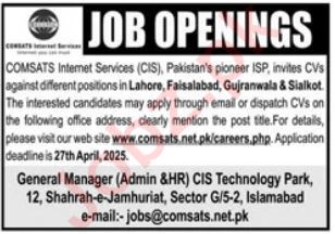 COMSATS Internet Services Lahore, gujranwala, sialkot, lahore and faisalabad Punjab Pakistan invites applications from eligible candidates for the post of Assistant Manager Sales, Accountant, Deputy General Manager - Operations and Deputy General Manager - Core Networks as per advertisement of April 13, 2025 published in daily Jang Newspaper. Persons with Bachelor and Master etc. education can apply.