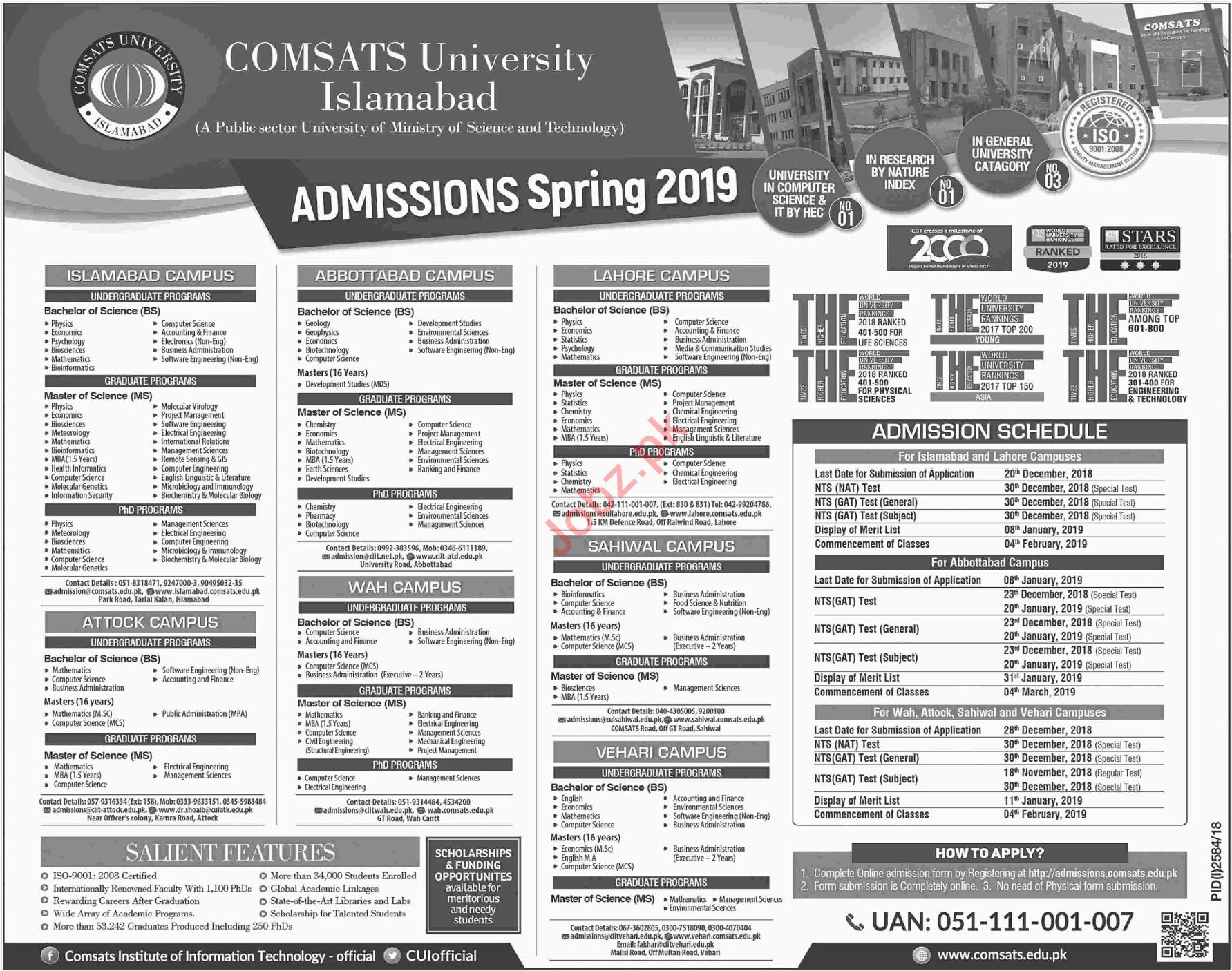 COMSATS University Islamabad, Pakistan are started admissions spring 2019 for the classes of BS, MS, PhD Programs Physics, Engineering, Biochemistry & Mathematics. Read newspaper ad for exact details.