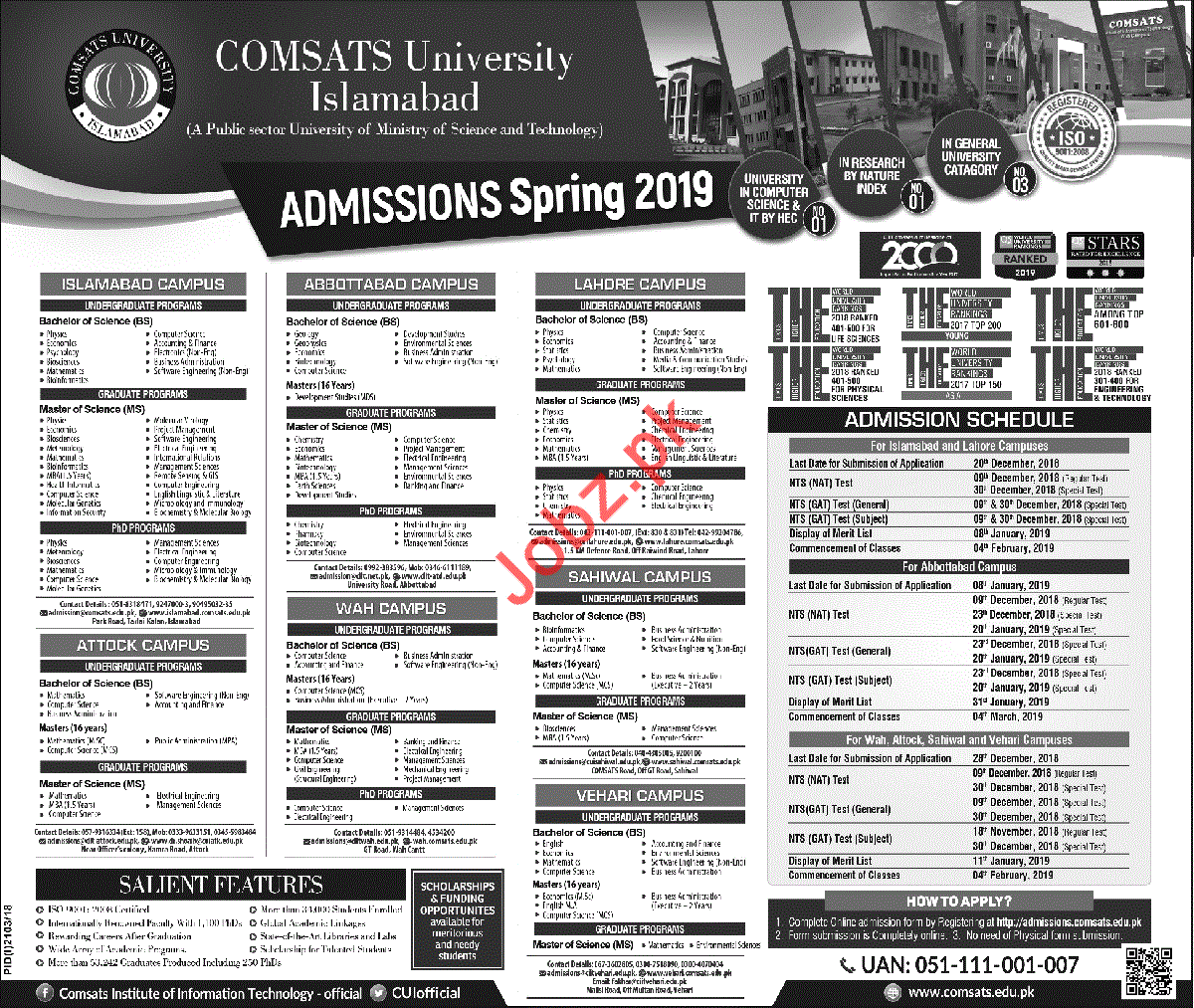 A leading and well known COMSATS University is offering admissions for Bachelors Degree Programmes for Islamabad Campus, Abbottabad Campus, Lahore Campus, Wah Campus, Sahiwal Campus, Attock Campus & Vehari Campus. Read newspaper ad for exact details.