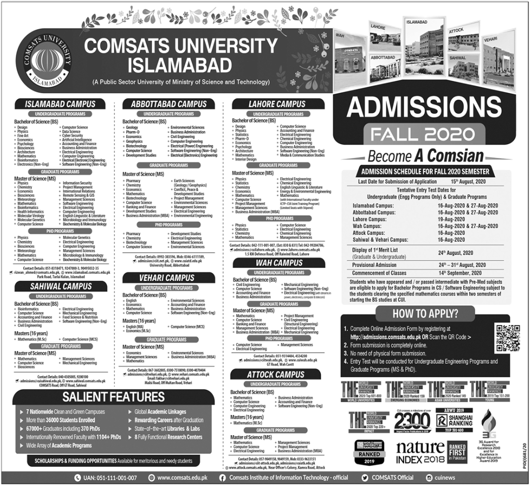 Comsats University Islamabad has announced admissions in BS Degree Programs, MS Degree Programs and PhD Degree Programs in Islamabad Campus, Abbottabad Campus, Lahore Campus, Sahiwal Campus, Vehari Campus, Wah Cantt Campus. Read newspaper ad for exact details.