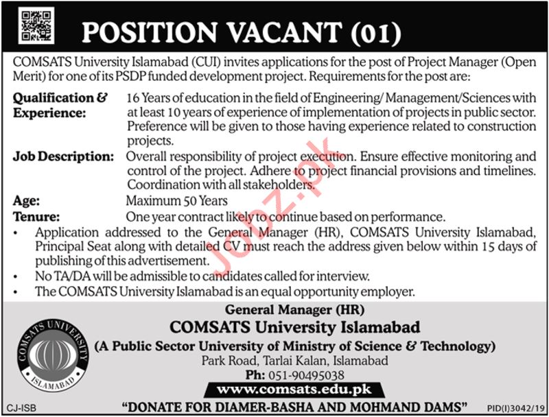 Comsats University Islamabad CUI Job For Project Manager