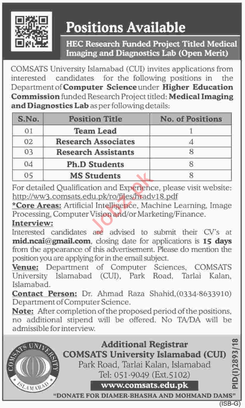Comsats University Islamabad Jobs 2019 Research Assistant