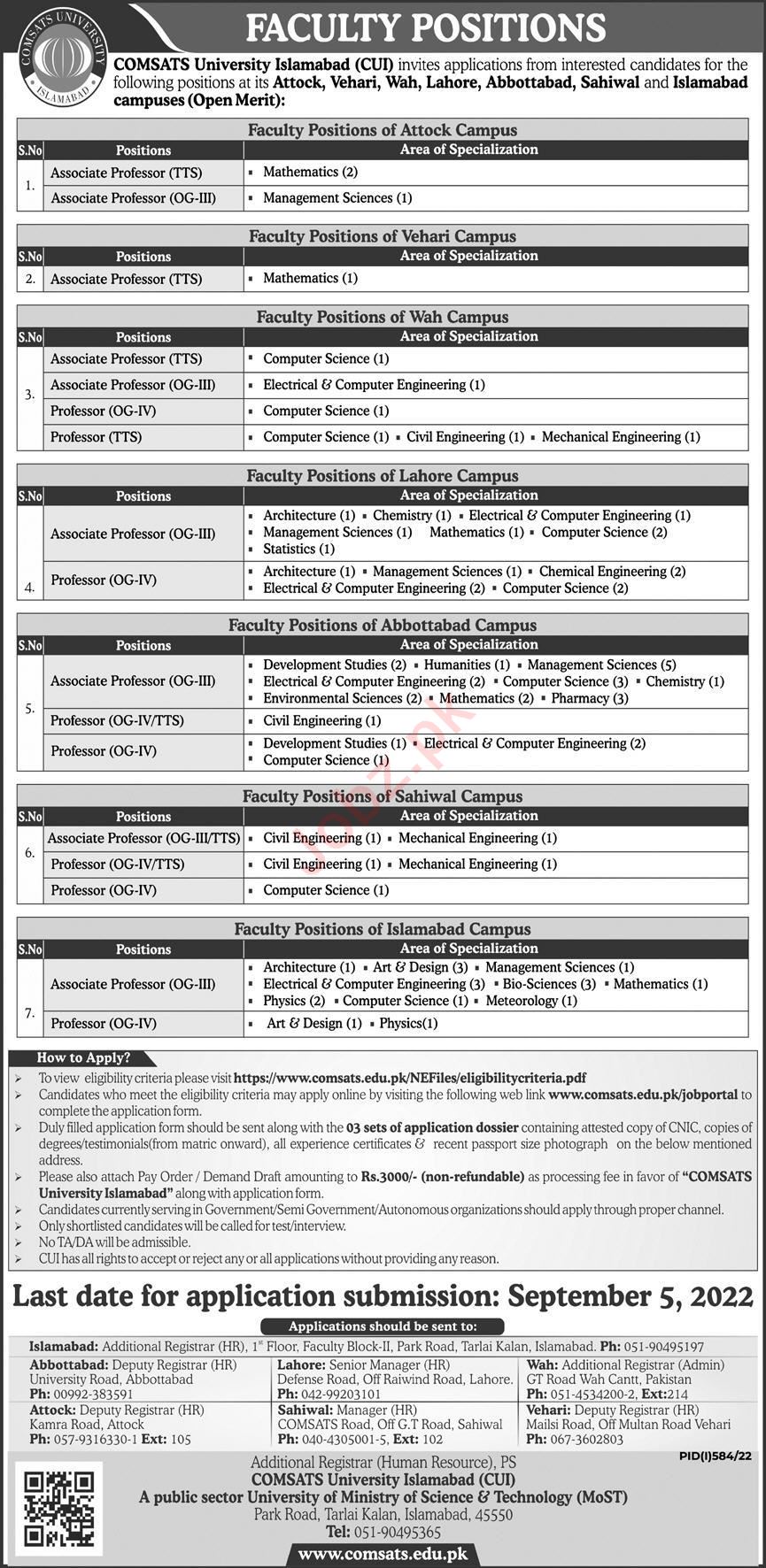 Comsats University is looking for candidates for following posts as per job advertisement published in daily Express Newspaper of July 31, 2022 for location Islamabad, islamabad Islamabad Pakistan: