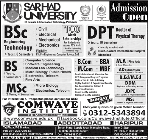 Comwave Institute Admission in BSc Engineering Technology, DPT Doctor of Physical Therapy, BS Computer Sciences, Software Engineering, Medical Lab Technology, B.Com in Islamabad. Read newspaper ad for exact details.