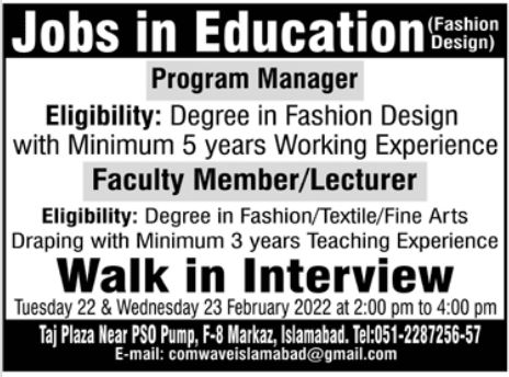 Vacant posts including lecturer and program manager are announced in COMWAVE Institute of Science & Information Technology Islamabad, islamabad Islamabad Pakistan as per 20 February 2022 advertisement in daily Jang Newspaper. Candidates with Bachelor and Master etc. educational background will be preferred.