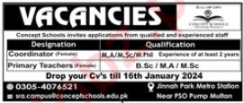 Vacant posts including primary teacher and coordinator are announced in Concept Schools Multan, multan Punjab Pakistan as per 14 January 2024 advertisement in daily Jang Newspaper. Master, Bachelor, Mphil, MA, MS and M.sc etc. educational qualification will be preferred.