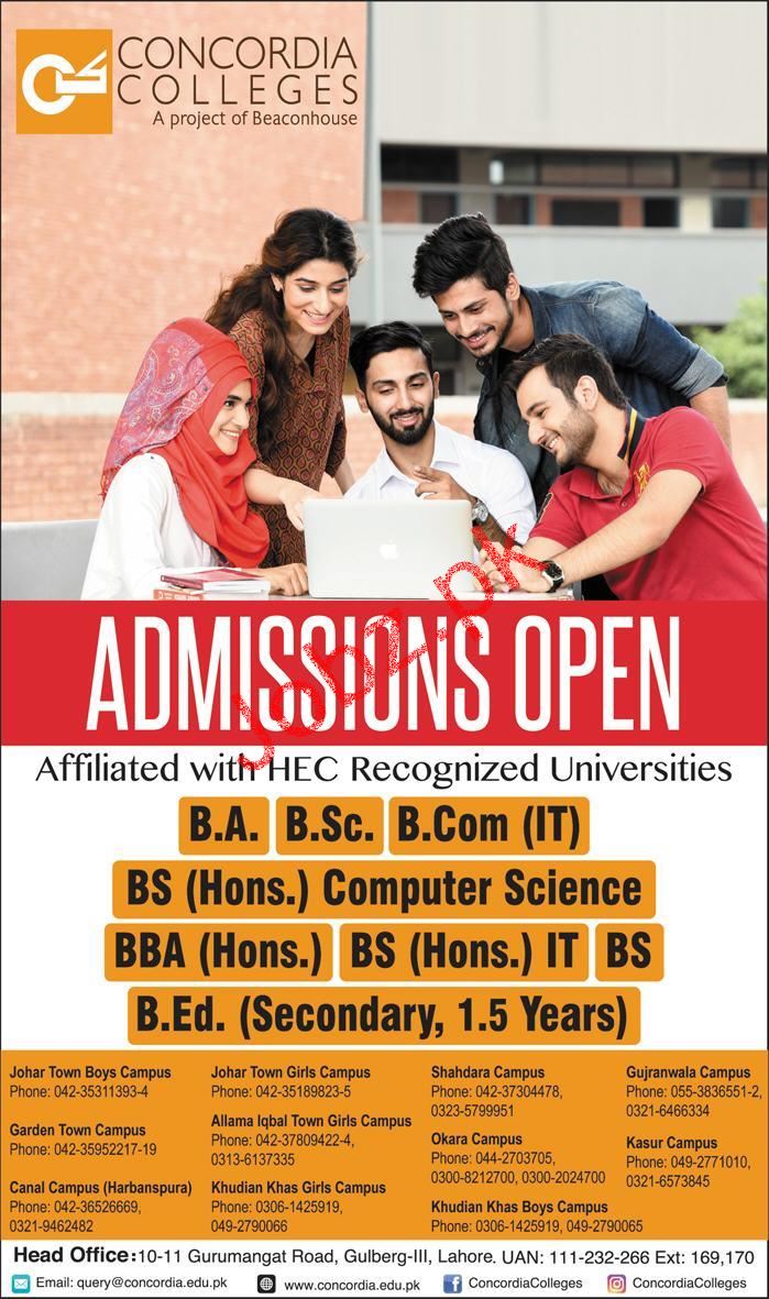 Concordia College Admission in BA,, BSc, B.Com, BBA Honors, BS Honors Information Technology, B.Com Information Technology and B.Ed 1.5 Year Program in Gujranwala. Read newspaper ad for exact details.