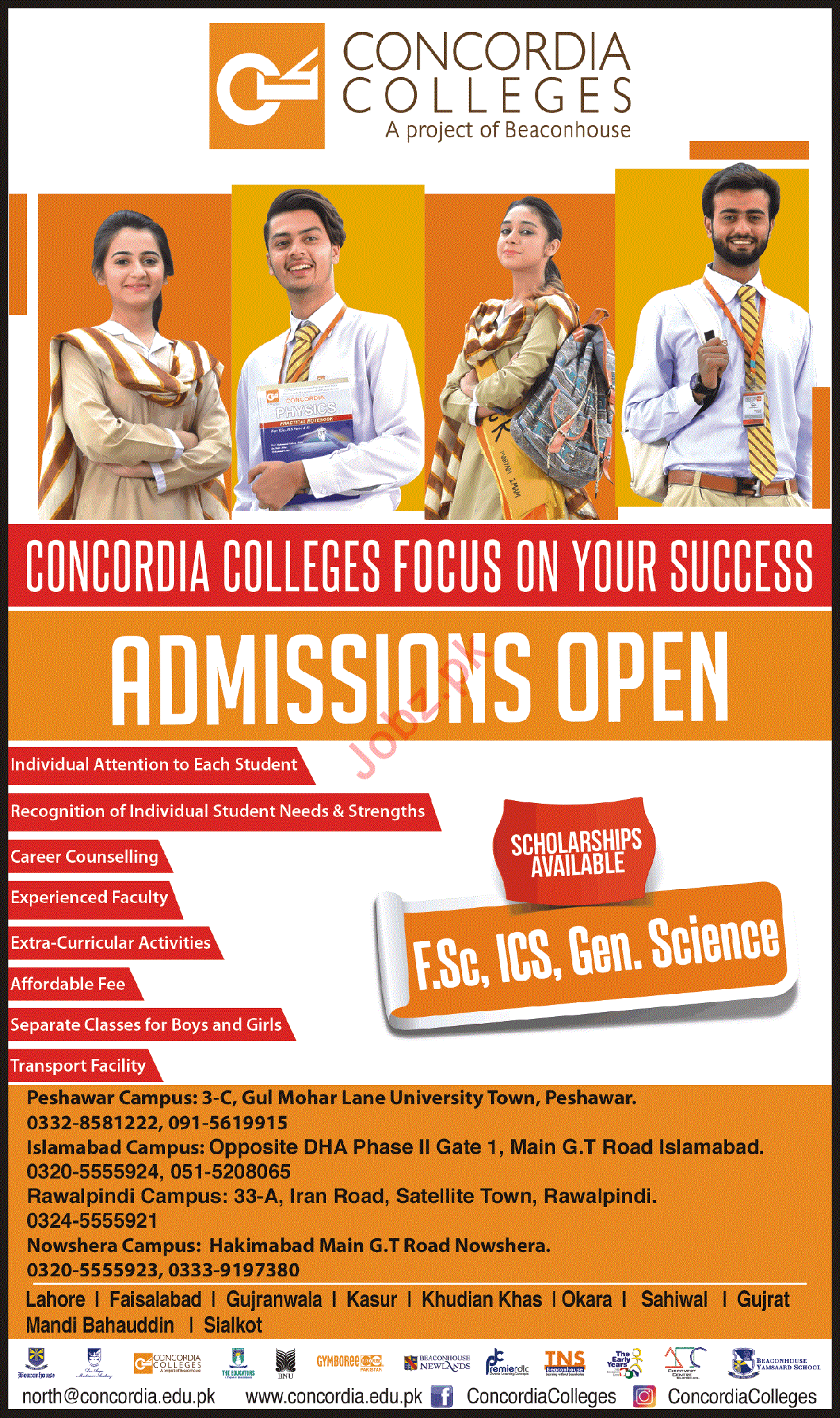 Concordia College Islamabad, Pakistan are started admissions fall 2019 for the classes of F Sc Pre Medical, Pre Engineering, General Science and Computer Science. Read newspaper ad for exact details.