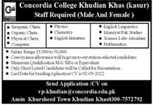 Concordia Colleges Kasur, kasur Punjab Pakistan invites applications from eligible candidates for the post of math teacher, chemistry teacher, computer teacher and physics teacher as per advertisement of April 24, 2022 published in daily Jang Newspaper. Preferred Education is B.ed, Master, MS, Phd and Mphil etc.