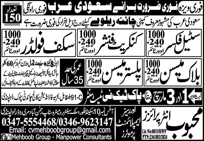 Mehboob Enterprises Overseas Employment Promoters jobs advertisement dated about 1 March 2024 in daily Express Newspaper invites application for the vacant post of steel fixer, block mason, concrete finisher, plaster mason, mason and scaffolder in Jeddah, riyadh Saudi Arabia. Candidates with Matric and Intermediate etc. educational background will be preferred.