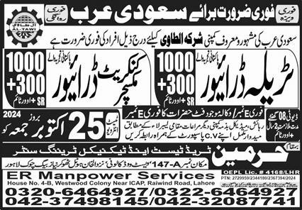 Vacant posts including driver, htv driver, concrete mixer driver and traila driver are announced in Harmain Trade Test & Technical Training Center Jeddah, dammam Saudi Arabia as per 24 October 2024 advertisement in daily Express Newspaper. Educational qualifications required Intermediate and Matric etc.