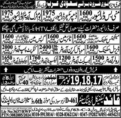 Sound Lines Recruiting Promotion jobs advertisement dated about 16 November 2024 in daily Express Newspaper invites application for the vacant post of Diesel Mechanic, Htv Driver, Mini Bus Driver, Mobile Crane Operator, Boom Truck Driver, Maintenance Mechanic, Backhoe Loader Operator, Greece Man, Dumper Mixer Driver, Concrete Pump Operator, Bobcat Operator, Roller Operator, Excavator Operator, Driver and Tyre Man in Dammam, tabuk Saudi Arabia. Persons with B.E, Bachelor, DAE, Matric and Intermediate etc. education can apply.