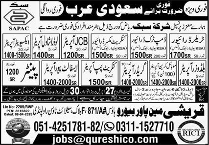 Qureshi Manpower Bureau invites applications for job positions advertised in daily Express dated 25 April 2025 for following vacancies in Riyadh, jeddah Saudi Arabia.