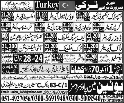 Union Manpower Services jobs advertisement dated about 17 June 2025 in daily Express Newspaper invites application for the vacant post of grader operator, loader operator, leaf spring mechanic, rock operator, backhoe loader operator, dumper driver, jcb operator, shawl operator, excavator operator, concrete pump operator, truck mechanic, translator, construction machinery repairman, washer, auto electrician, mixer driver and dozer operator in Riyadh, al khobar Saudi Arabia. Intermediate, BA, Bachelor, Matric and DAE etc. educational qualification will be preferred.