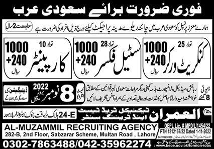 Vacant posts including carpenter, steel fixer and concrete worker are announced in Al Imran Technical Trade Test Center Madina, makkah Saudi Arabia as per 3 November 2022 advertisement in daily Express Newspaper. Preferred Education is Matric and Middle etc.