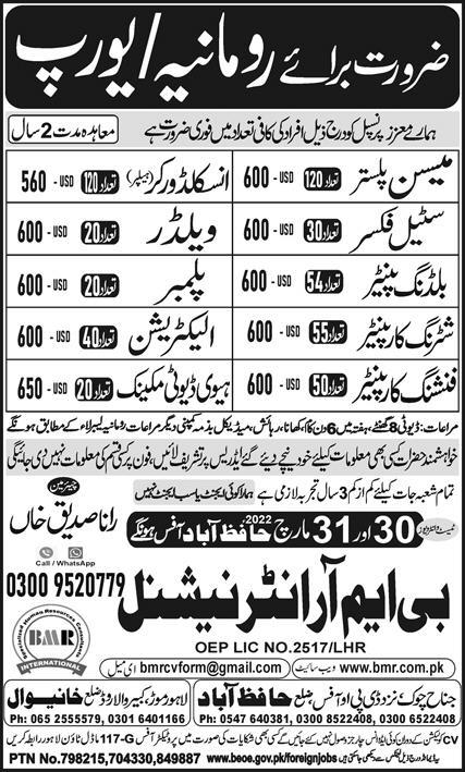 BMR International jobs advertisement dated about 29 March 2022 in daily Express Newspaper invites application for the vacant post of heavy duty mechanic, electrician, building painter, plaster mason, steel fixer, welder, shuttering carpenter, plumber, unskilled worker and finishing carpenter in Romania, romania Romania. Preferred Education is Intermediate, Matric and Middle etc.