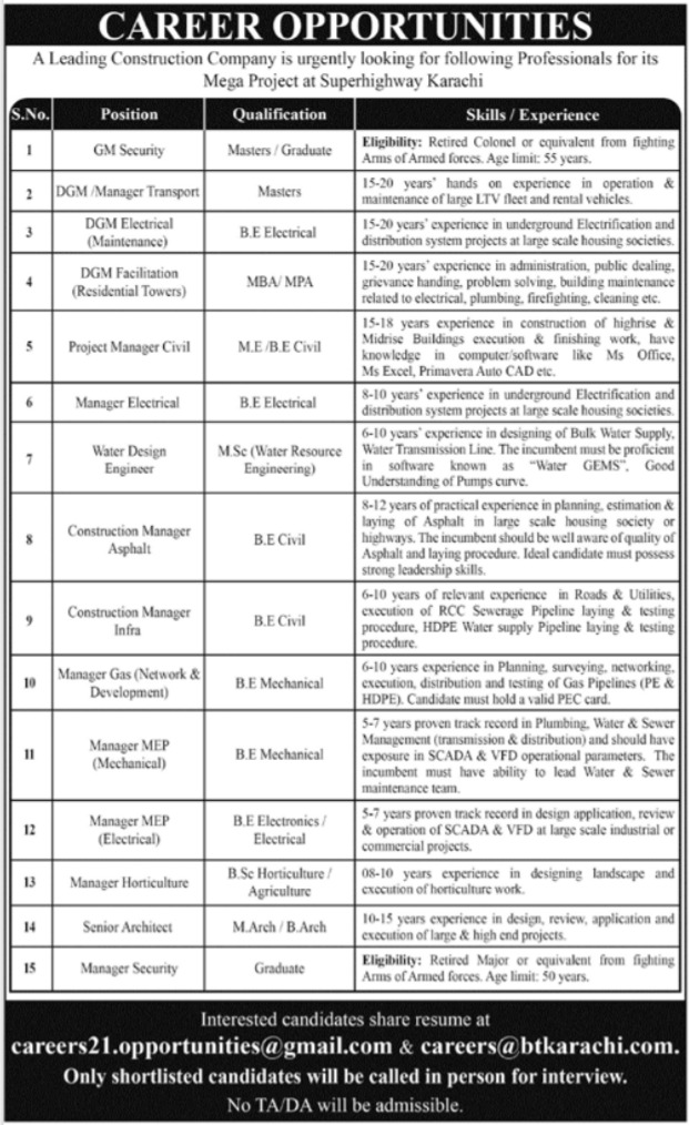 Construction Company Karachi, karachi Sindh Pakistan invites applications from eligible candidates for the post of dgm facilitation, project manager civil, manager security, gm security, dgm, manager gas, manager electrical, manager transport, manager horticulture, architect, manager mep mechanical, construction manager and water design engineer as per advertisement of March 13, 2022 published in daily Jang Newspaper. Persons with MBA, Master, B.E and Bachelor etc. education can apply.