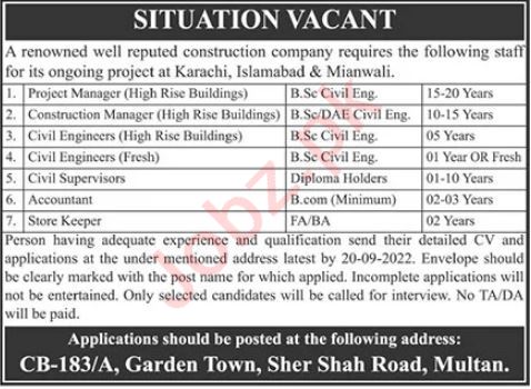 Construction Company is looking for candidates for following posts as per job advertisement published in daily The News Newspaper of September 11, 2022 for location Multan, multan Punjab Pakistan: