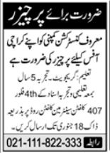 Construction Company Karachi Sindh Pakistan invites applications from eligible candidates for the post of Purchaser as per advertisement of January 12, 2022 published in daily Jang Newspaper. Candidates with Bachelor etc. educational background will be preferred.