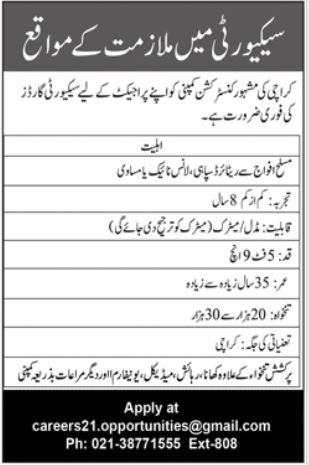Construction Company Karachi, karachi Sindh Pakistan invites applications from eligible candidates for the post of security guard as per advertisement of May 7, 2023 published in daily Jang Newspaper. Persons with Matric and Middle etc. education can apply.
