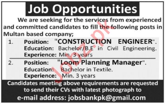 Construction Engineer & Loom Planning Manager Jobs In Multan