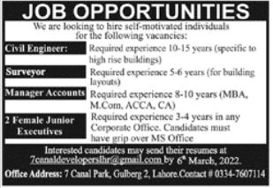 Construction Firm Lahore, lahore Punjab Pakistan invites applications from eligible candidates for the post of manager accounts, civil engineer, executive and surveyor as per advertisement of February 27, 2022 published in daily Jang Newspaper. Educational qualifications required Master and Bachelor etc.