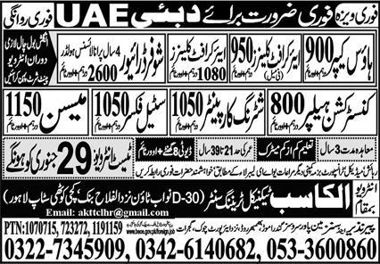 Al Kasib Technical Training Center jobs advertisement dated about 22 January 2023 in daily Express Newspaper invites application for the vacant post of driver, shuttering carpenter, construction helper, mason, aircraft cleaner, steel fixer and house keeper in UAE, dubai UAE. Educational qualifications required Matric, Middle and Primary etc.