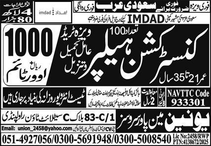 Union Manpower Services jobs advertisement dated about 12 November 2025 in daily Express Newspaper invites application for the vacant post of construction helper in Riyadh, makkah Saudi Arabia. Educational qualifications required Matric and Middle etc.