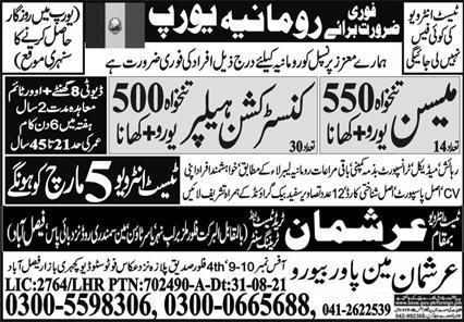 Arshman Manpower Bureau jobs advertisement dated about 4 March 2022 in daily Express Newspaper invites application for the vacant post of mason and construction helper in Romania, romania Romania. Persons with Matric and Middle etc. education can apply.