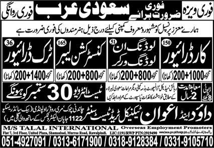 Dawood & Awan Technical Trade Test Center jobs advertisement dated about 29 September 2024 in daily Express Newspaper invites application for the vacant post of construction labor, car driver, unloading worker, truck driver and loading worker in Makkah, makkah Saudi Arabia. Preferred Education is Matric, Primary and Middle etc.